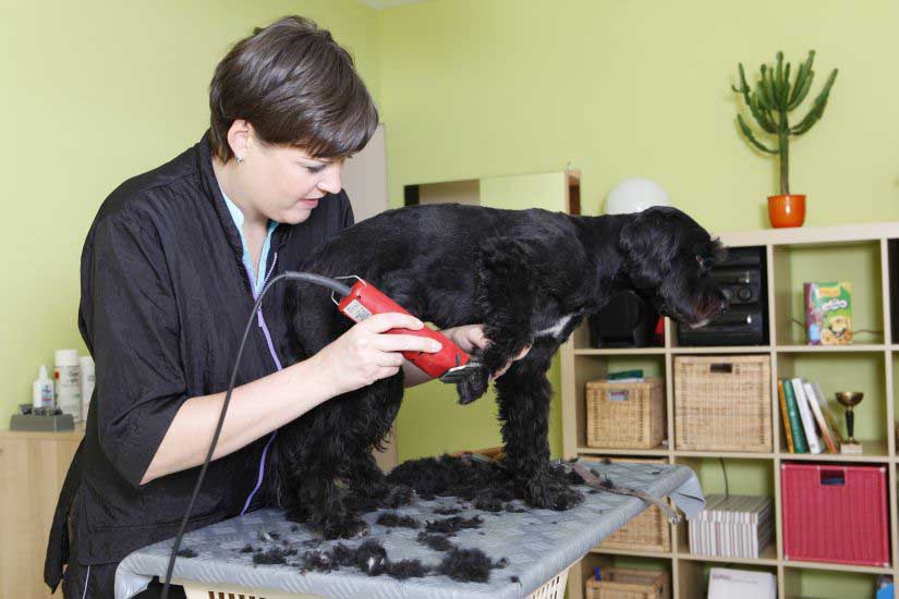 Beim Scheren wird das Hundefell per Schermaschine mit den Strich gekürzt, die schnellste Variante für einen frischen Kurzhaarschnitt. Verschiedene Größen von Solingen-Scherköpfen schneiden das Hundehaar je nach Jahreszeit auf eine Länge von 1 bis 19 Millimeter